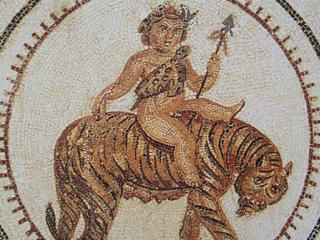 Mosaic of infant Baccus holding a spear and riding a tiger