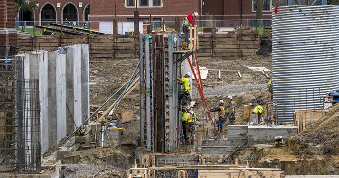 The new Humanities and Social Studies Complex (HSSC) moved closer to reality this spring with the arrival of heavy construction equipment and a tower crane on the northwest corner of the academic quad.