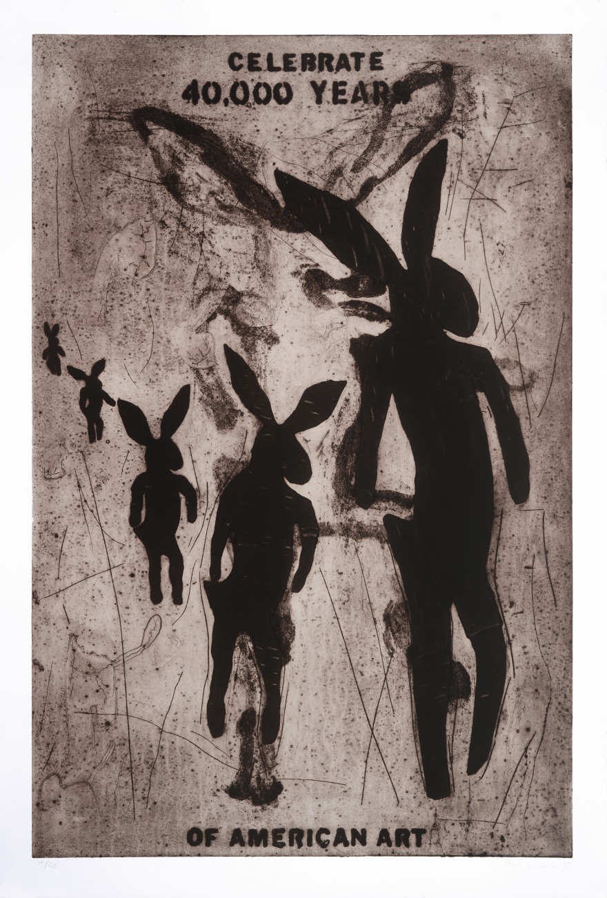The collagraph features a large standing rabbit that appears to be walking upright towards the foreground. The sense of movement is suggested through the depiction of the rabbit multiple times in increasingly larger scale. Smith’s inspiration for the rabbit image was a book about the Peterborough petroglyphs of Ontario. The rabbit petroglyph was a very early form of art found in North America, and it resonated with Quick-to-See Smith about a history of Native American art that predates the history of art in Western culture.
