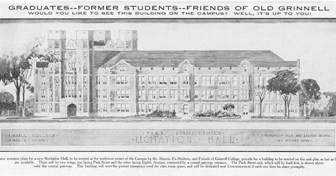 In a Jan. 12, 1916, issue of the Scarlet & Black, a student wrote with anticipation about ARH’s construction: “The building will be just exactly what it is termed; a recitation building. It will put Grinnell right on a par in this department with any college in the country. It will be modern, substantial, and built for the future. It will provide for the needs of Grinnell for years to come.”