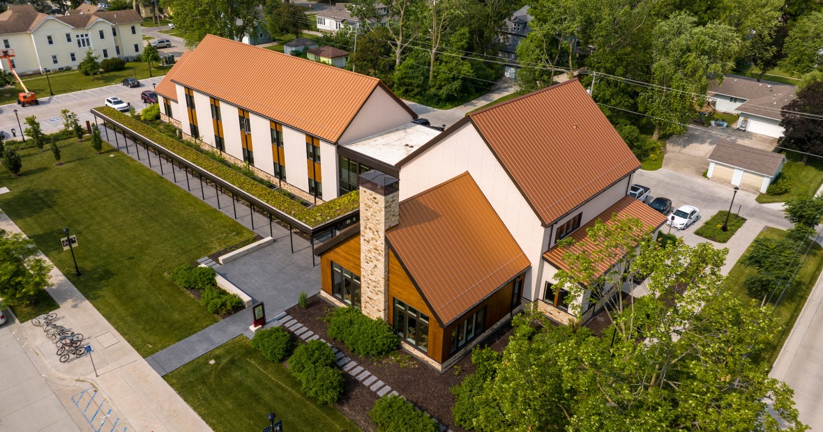 - A covered walkway from the parking lot to the front entrance that will gain a green roof next spring; and
