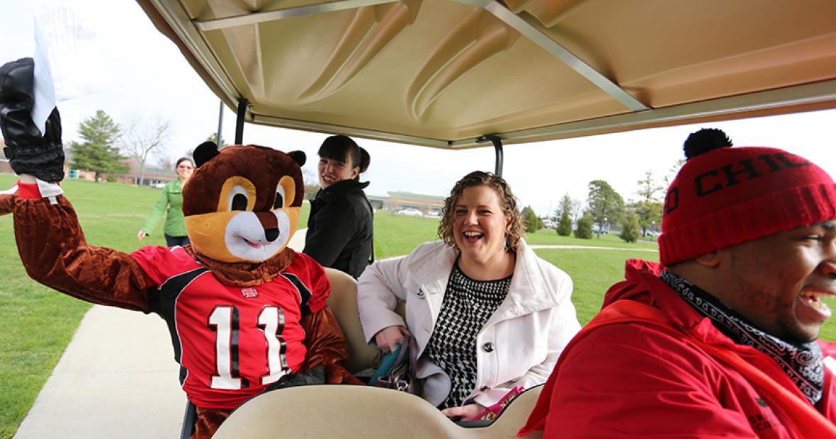New activities on campus included an ice cream social and a person cavorting in a squirrel costume. Aamir Walton ’15, assistant director of annual giving, and Greg Ruzich ’16 both dressed up as Scarlet the squirrel for part of the day and asked Grinnell trivia questions while giving students rides across campus on a golf cart.
