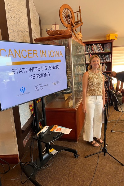 Also in the Des Moines area, Tatum Watkins ’27 uses her political science major at the Harkin Institute for Public Policy and Citizen Engagement to complete a scientific review and community outreach about cancer rates and environmental risk factors in Iowa. The experience has allowed her to combine her interest in policy and science in a hands-on way and confirmed her interest in a public health career.